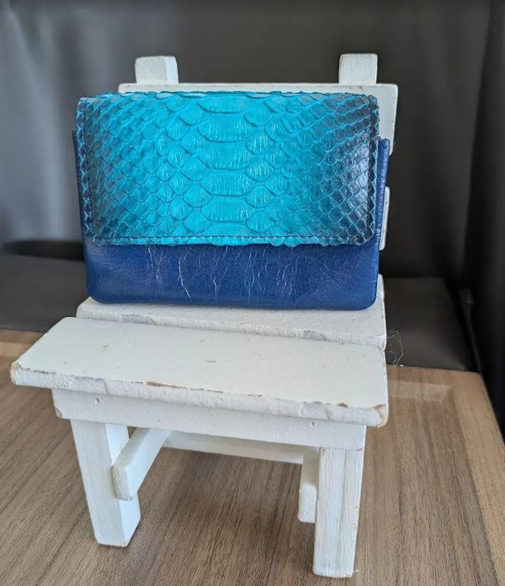 ブルーのグラデーションが美しい手染めパイソン蛇革をカブセに。軽くて手にやさしく馴染む上質ミニ財布