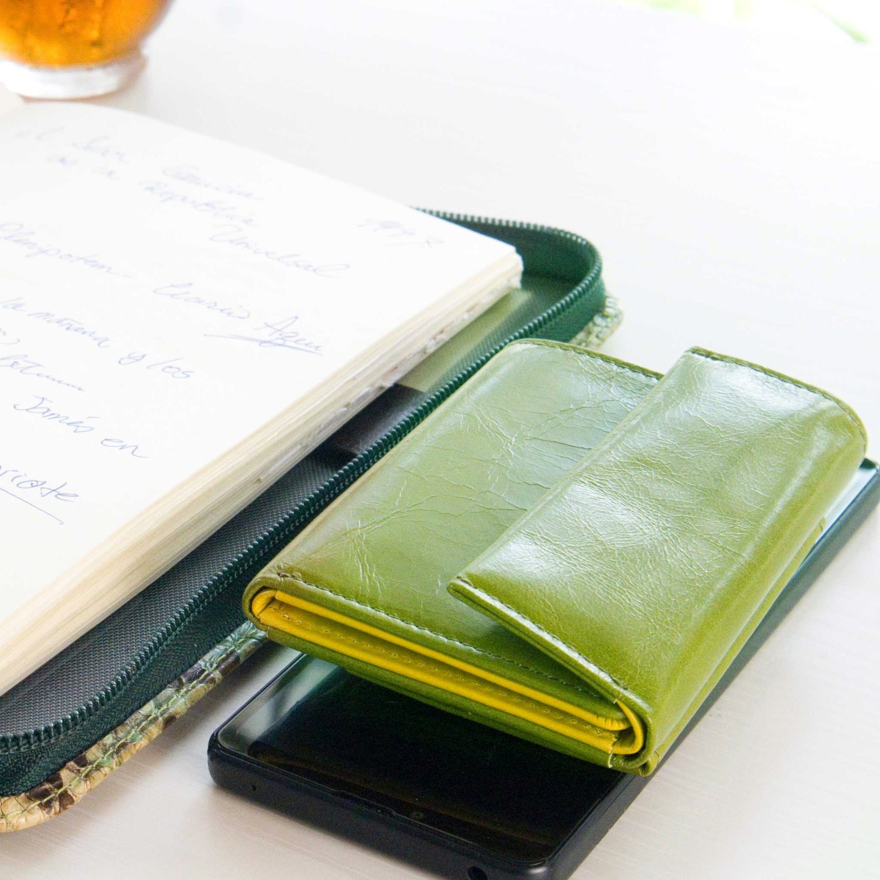【再入荷】コンパクト 二つ折り財布 牛革 ペケニータ (アップルグリーン・ソルイエロー)